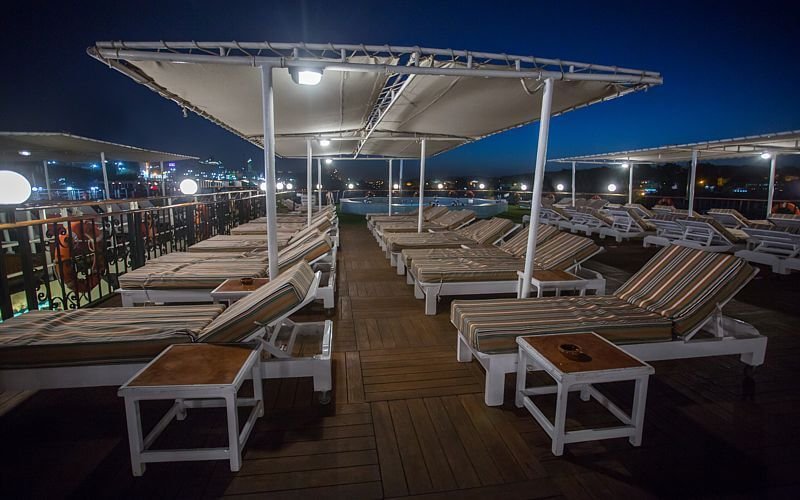 The cruise also boasts a dedicated bar area with cozy Chesterfield sofas and panoramic Nile views—ideal for a peaceful retreat with a good book. The expansive sun deck offers a swimming pool and bar, surrounded by stylish cane tables, chairs, and sun loungers, ensuring ultimate relaxation under the sun. A 24-hour reception is available for all services, including international phone access and safe deposit boxes. Additionally, the onboard gift shop sells a variety of practical items and Egyptian souvenirs.